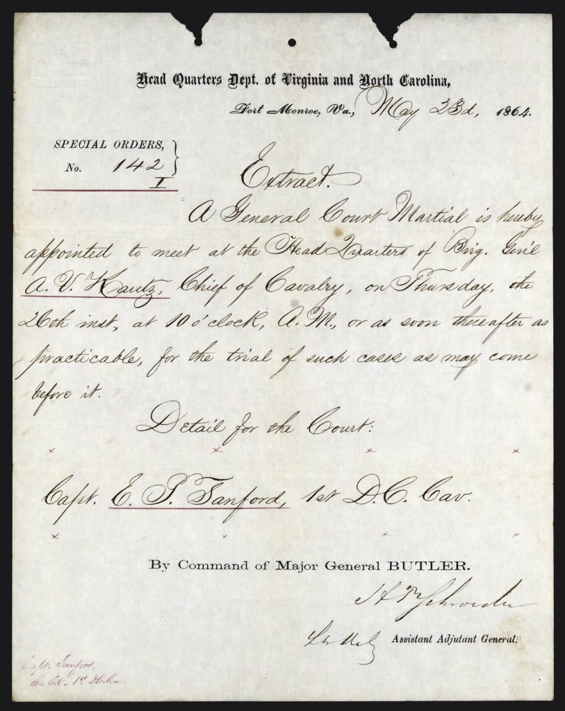 Another indication that Edward faced reckoning with fellow soldiers who struggled in the face of battle comes in this May 23 communication, ordering Edward back from his unit to serve on Court Martial duty…