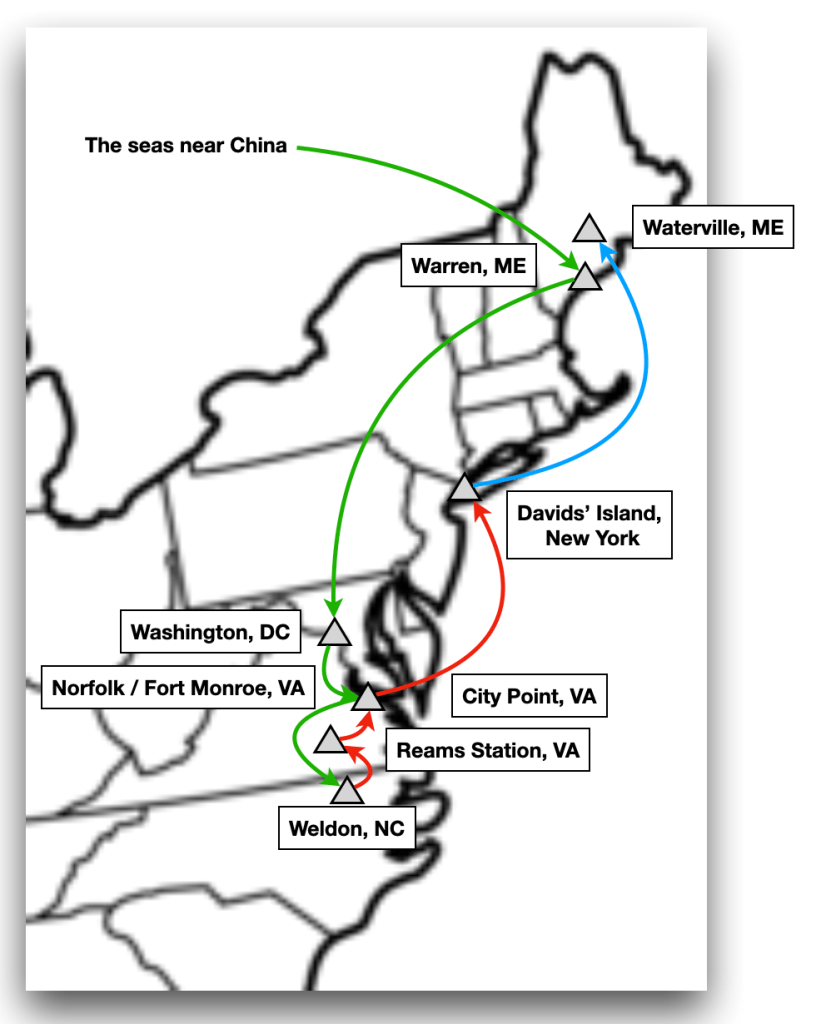The specific details of Edward’s return to America are unknown. He must have struck some sort of deal in a distant port to leave his uncle’s merchant ship and return serving on a Navy ship that was heading in the right direction. China was about as far from Maine as it was possible to go in 1861–from the far Pacific the trip would have taken the better part of a year, sailing either around Africa or South America.