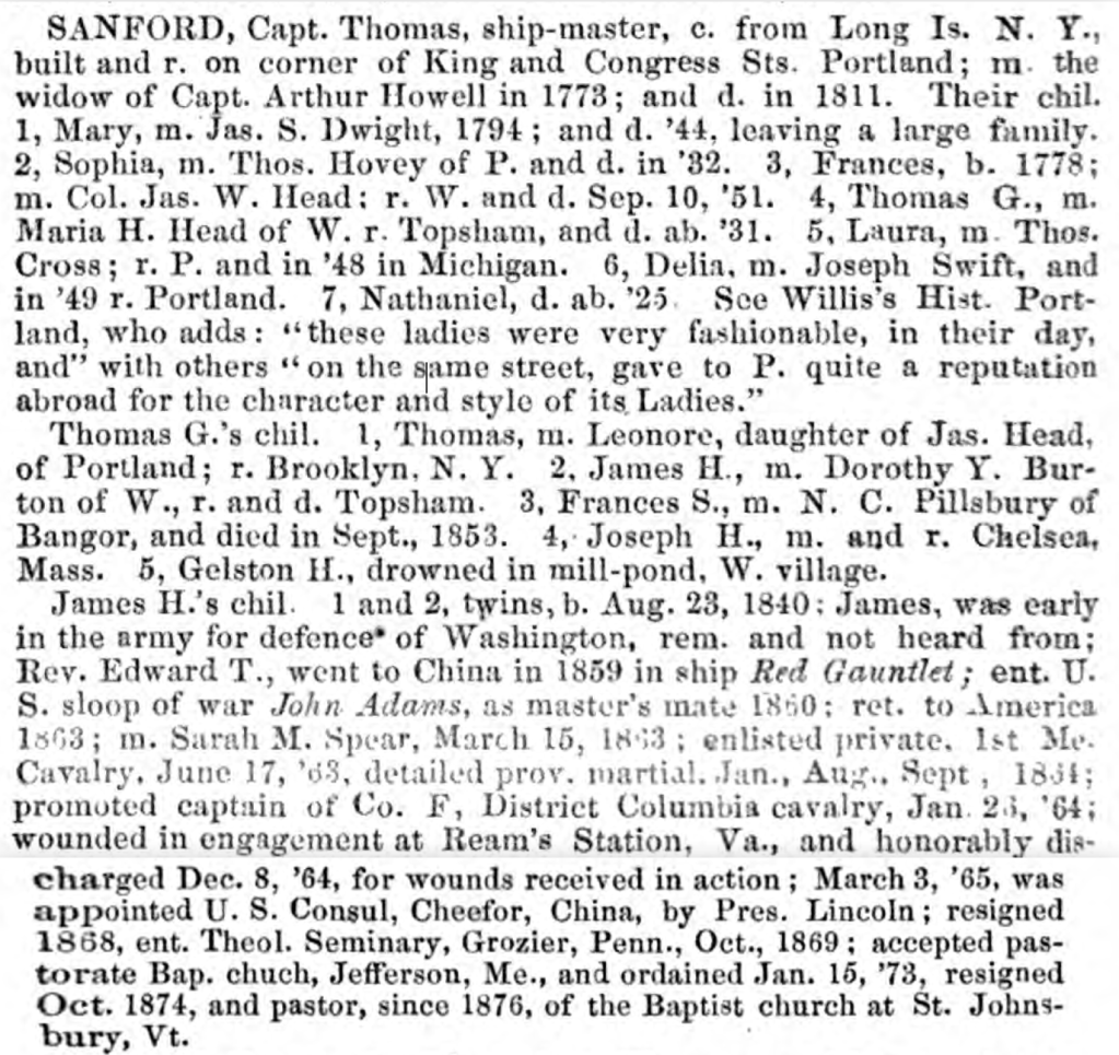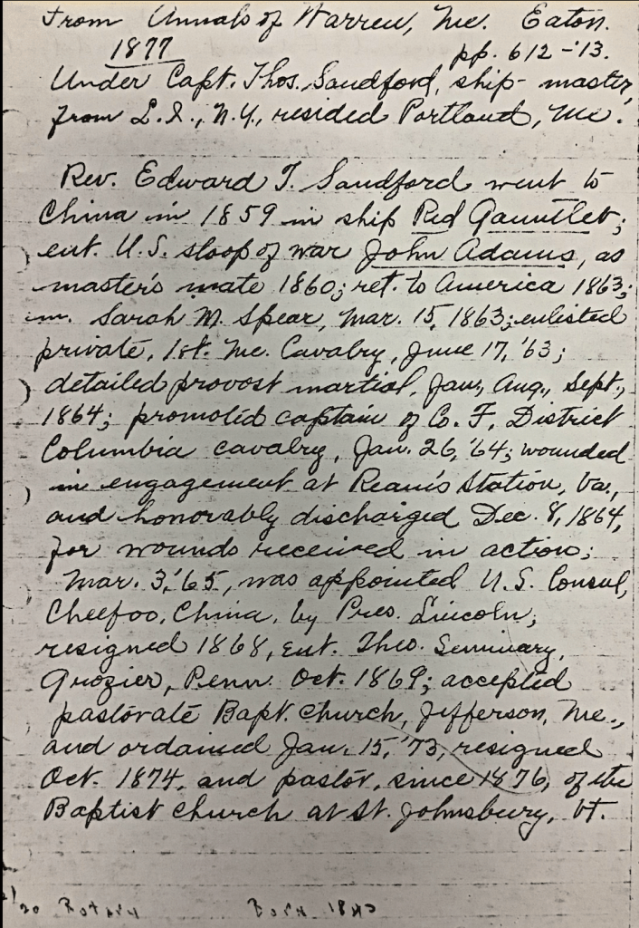 Edward was 24 years old when he returned to Maine. His son, our grandfather Joe, would not be born for another 28 years. There is much more to come in the story of Edward Sandford, including his return to China. His story will be continued in a future post.